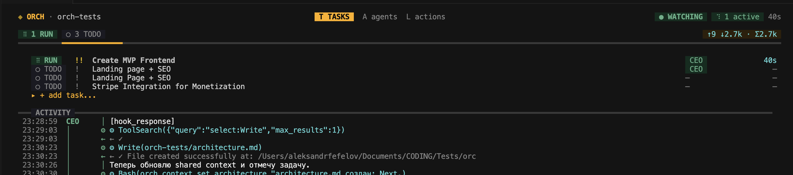 Define your vision as a goal. ORCH spins up backend, frontend, QA, and reviewer agents that build your API, UI, tests, and landing page in parallel. Ship a tested MVP in 48 hours, not 3 weeks.